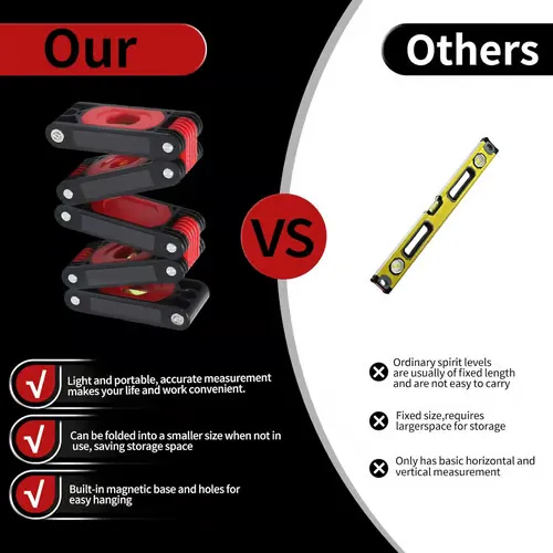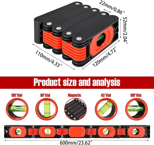 1. **Multi-functional Design:** This level isn't just about measuring straight lines. It integrates a range of tools into one compact unit, including a bubble level for accurate alignment, a ruler for precise measurements up to [specify length], and a foldable design for convenient storage and portability.