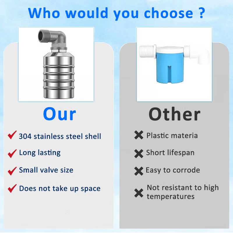Our water level control valve is made of food grade 304 stainless steel material, which is sturdy and safe to contact with water. It is impact resistance and enduring to use.
